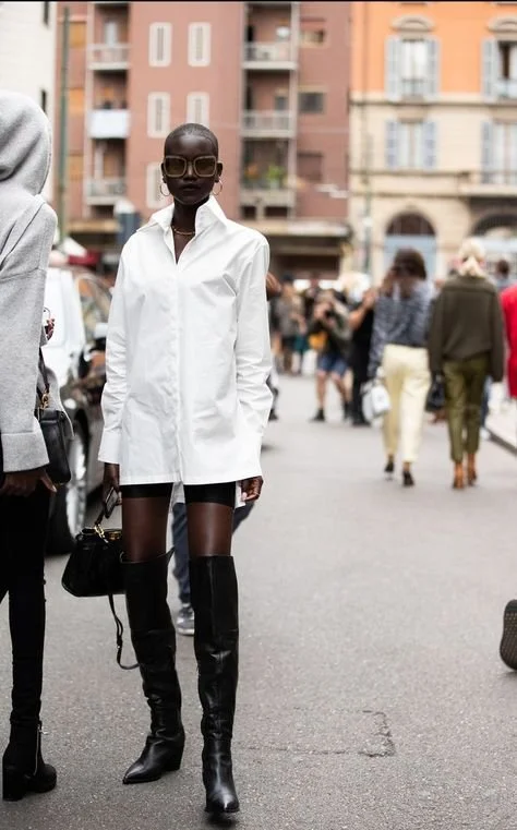 Love this with the biker shorts underneath and the high boots. Accessories are always key as well- notice the jewelry and the bag!