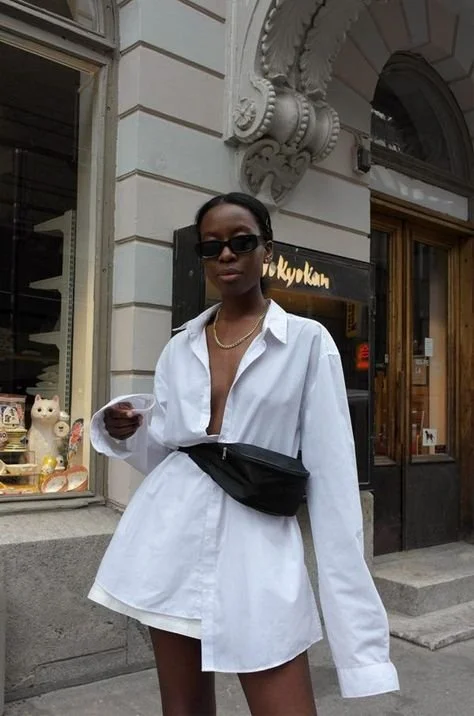 Notice how she added the white mini skirt underneath and the fanny pack bag to create shape at her waist!