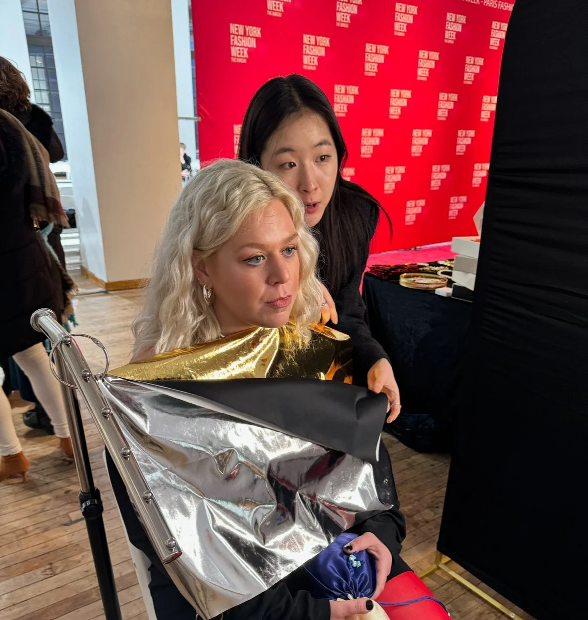 We were hoping to book a session with Ari, but unfortunately she was not booking for her normal services due to NYFW. When we went to a show during our time there, she hosted a booth and we got to stop by and meet her! Even though we weren't able to do the FULL color package, one of the things she did with us was show us which jewelry looked best with our skin tones- silver or gold?